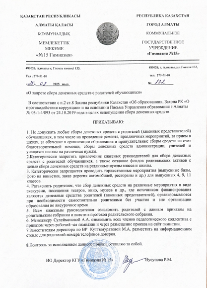 Оқушылардың ата-аналарынан ақша жинауға тыйым салу туралы бұйрық/Приказ о запрете сбора денег от родителей обучающихся