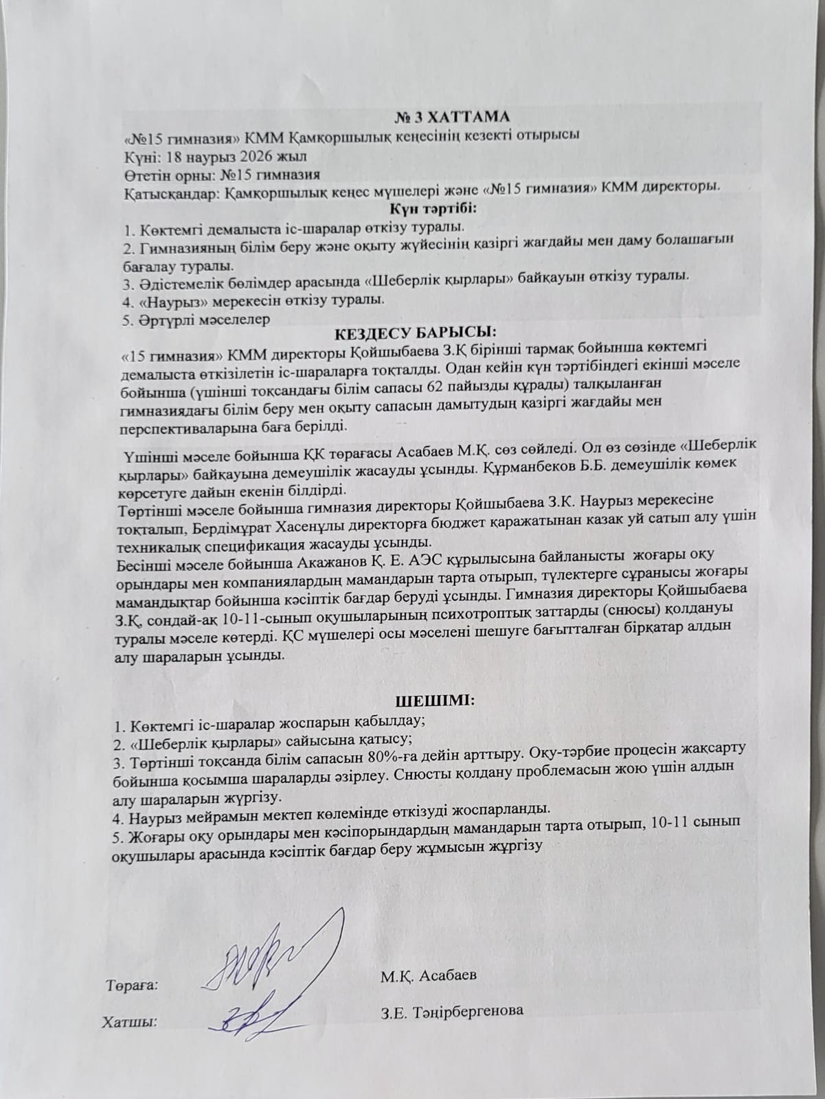 Протокол № 3 заседания Попечительского совета КГУ«Гимназия № 15» от 25 .04. 2024 года