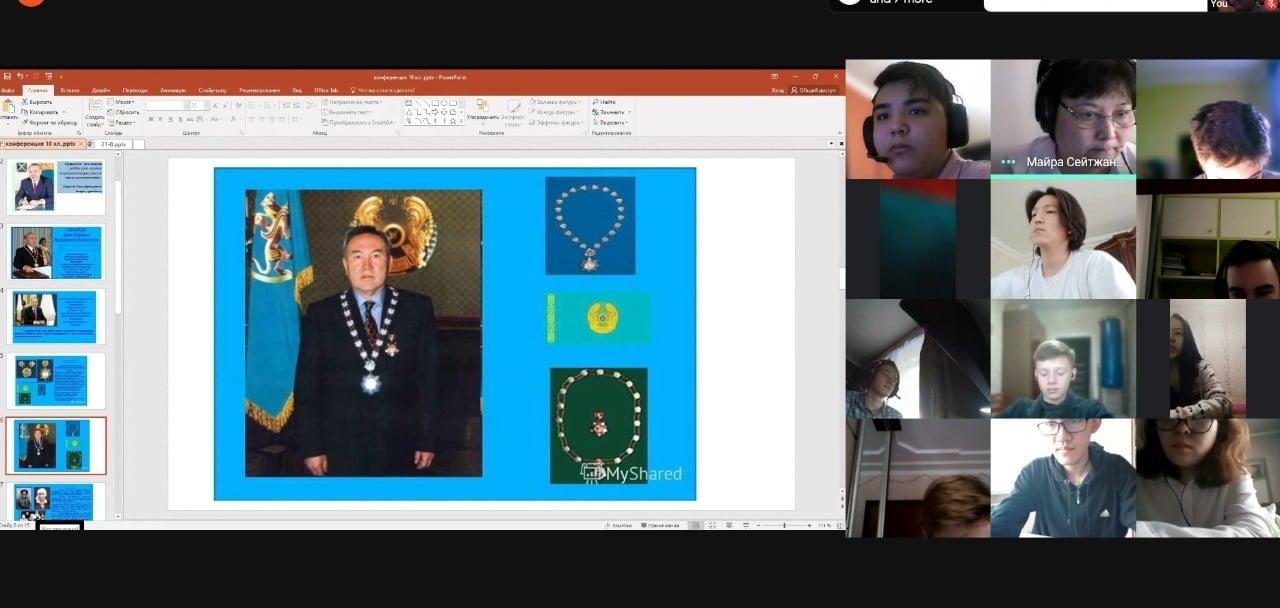 В преддверье Дня Первого Президента Республики Казахстан с учащимися 10 «Б» класса КГУ «Гимназия №15» города Алматы проведена онлайн-конференция на тему: «Роль Первого Президента в становлении Независимого Казахстана". Ребята рассказывали о жизни и деятельности Нурсултана Назарбаева. Детство, юность, зрелые годы… Показывая на слайдах фотографии, кадры из прошлого, видеофрагменты, десятиклассники словно перелистывали страницы истории родной страны, в становлении которой главенствующая роль принадлежала Елбасы.