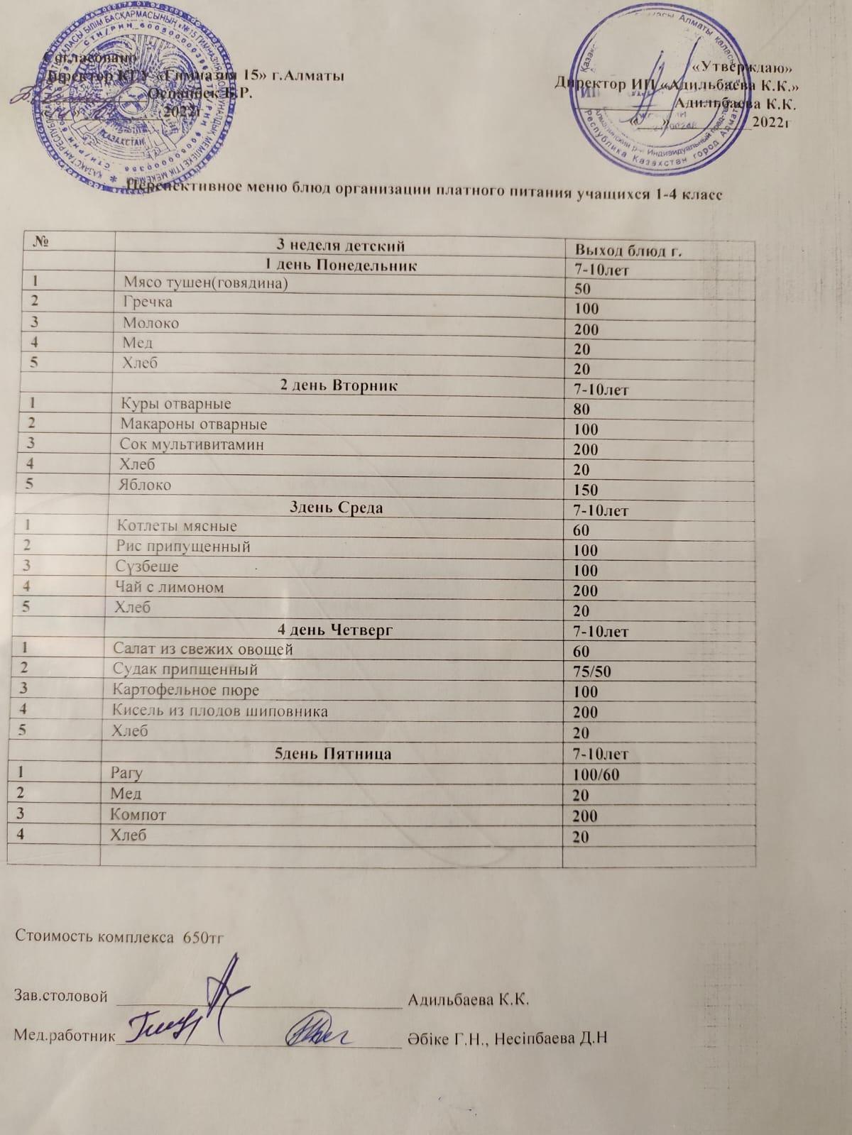 Перспективное меню блюд организации платного питания 3 неделя