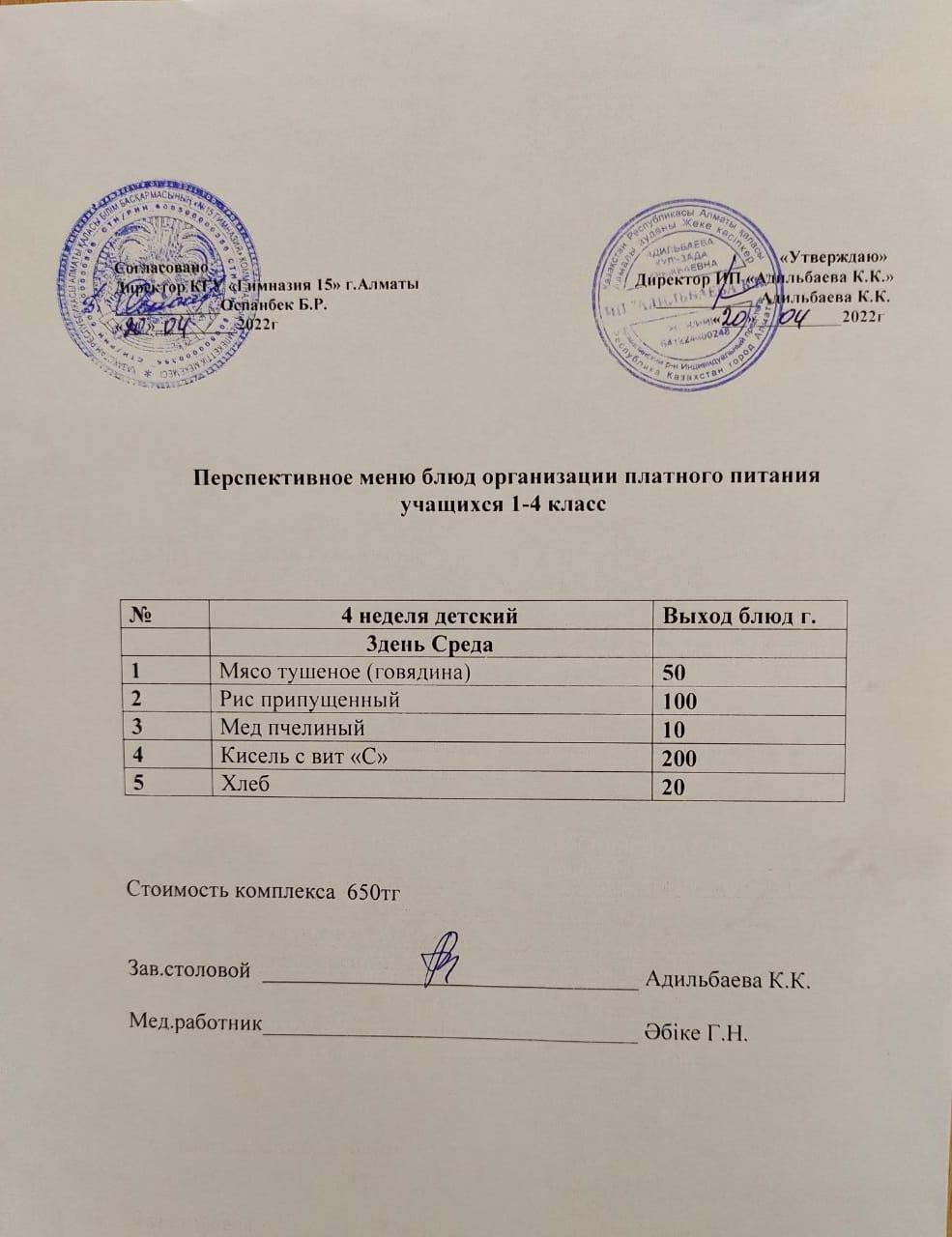 20 апрель 2022 0 1 2 3 4 5 Перспективное мею блюд организации платного питания учащихся 1-4 классов Осы беттің QR-коды:QR-код этой страницы: