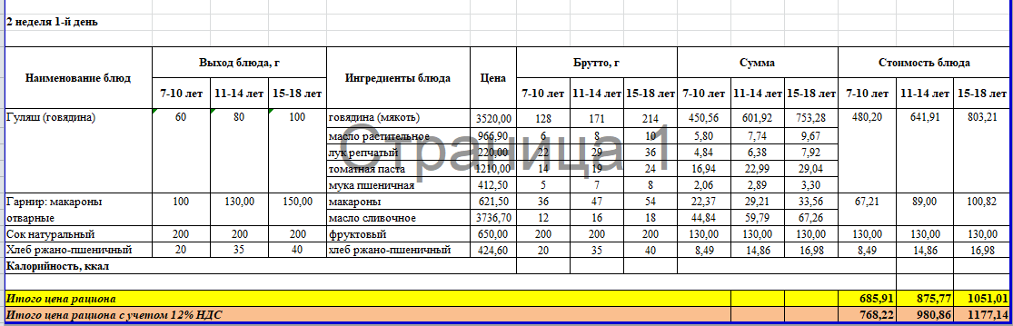 Меню 2 неделя 1 день