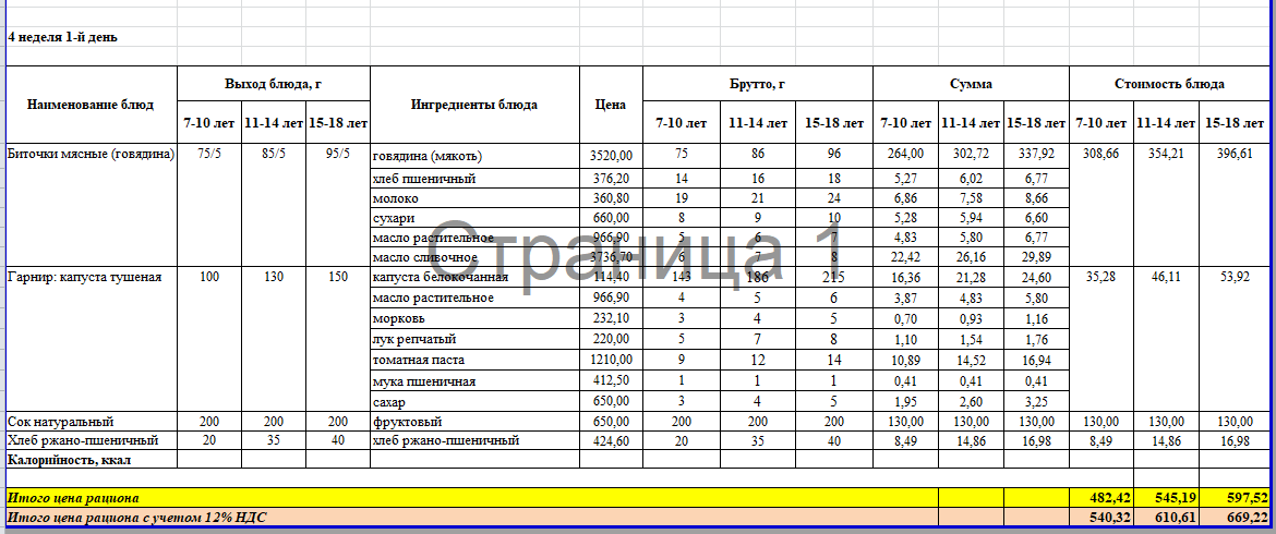 Меню 4 неделя 1 день