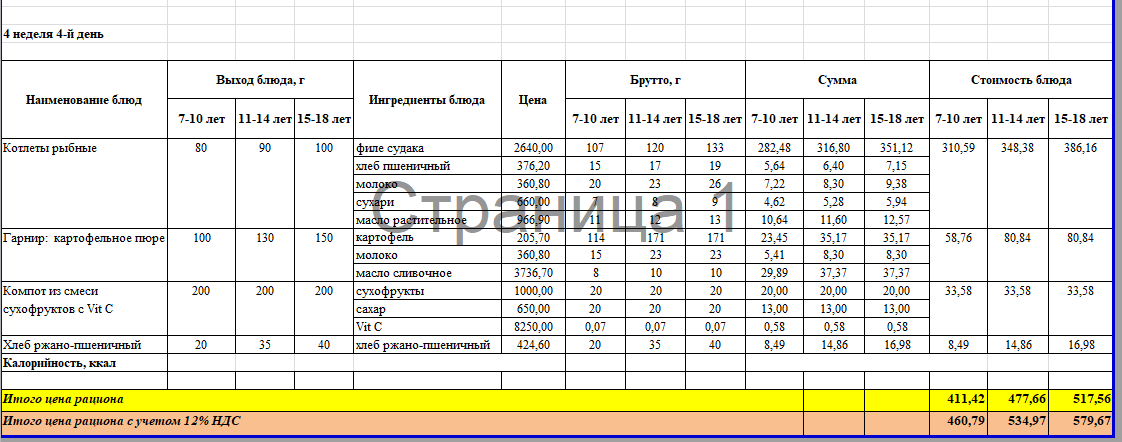 Меню 4 неделя 4 день