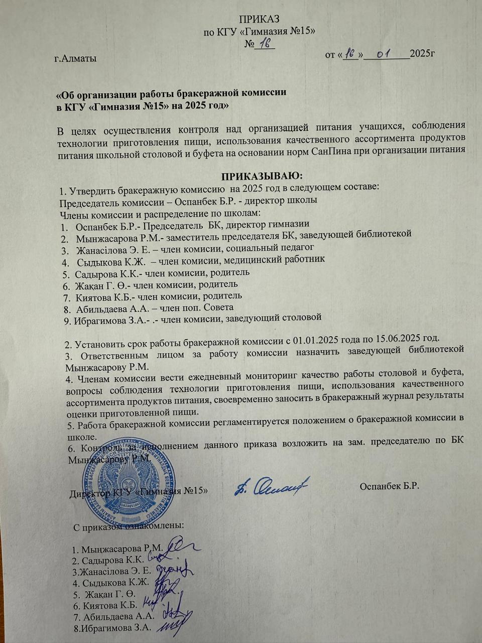 КММ "№15 гимназия" 2025 оқу жылына бракераж комиссиясының жұмысын ұйымдастыру туралы / Об организации работы бракеражной комиссии в КГУ "Гимназия №15" на 2025 год"