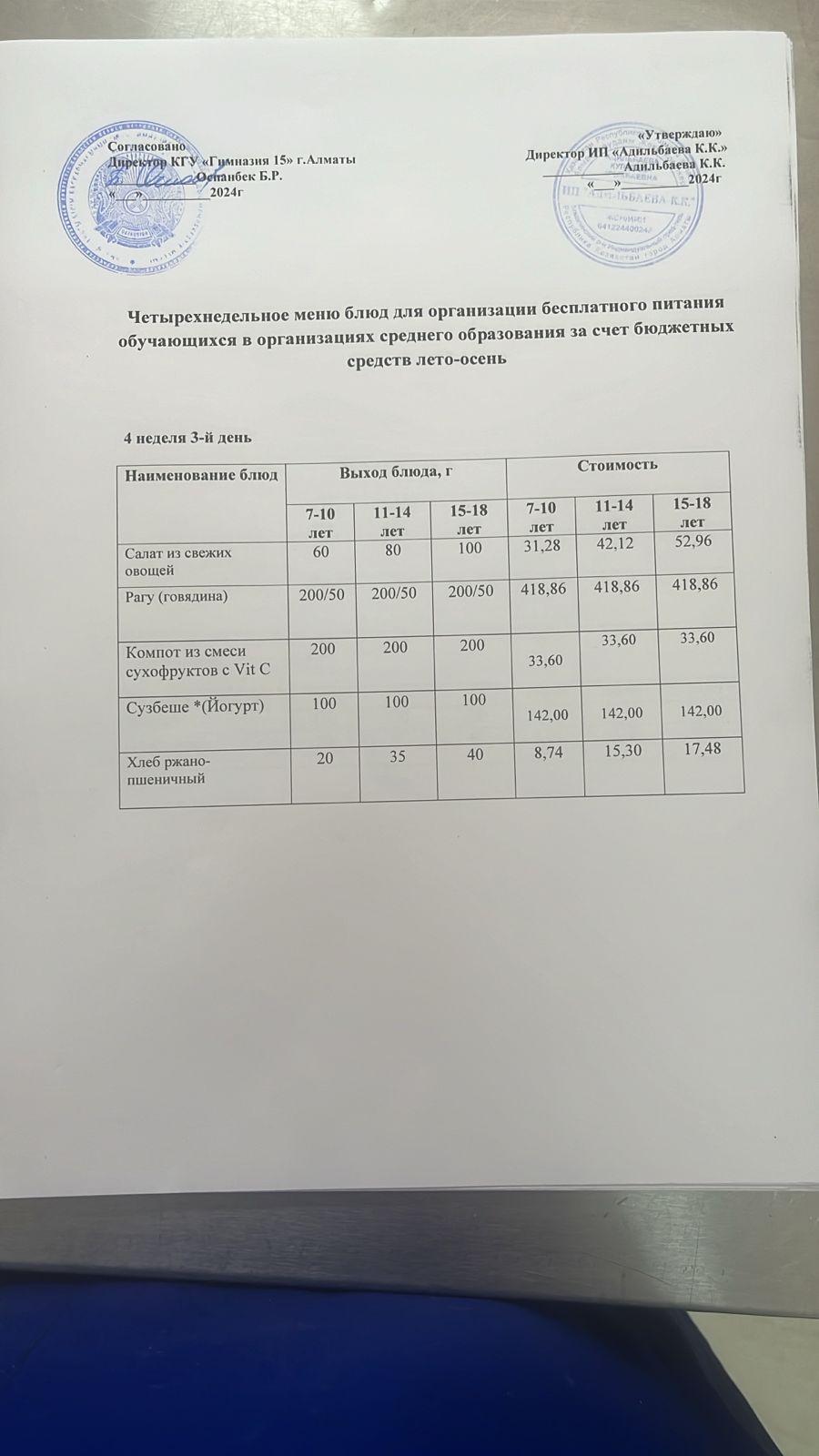 Ас мәзірі 2 апта 1 күн. 09.09.2024ж.