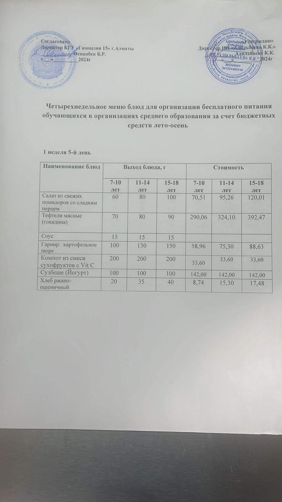 Ас мәзірі 2 апта 1 күн. 09.09.2024ж.