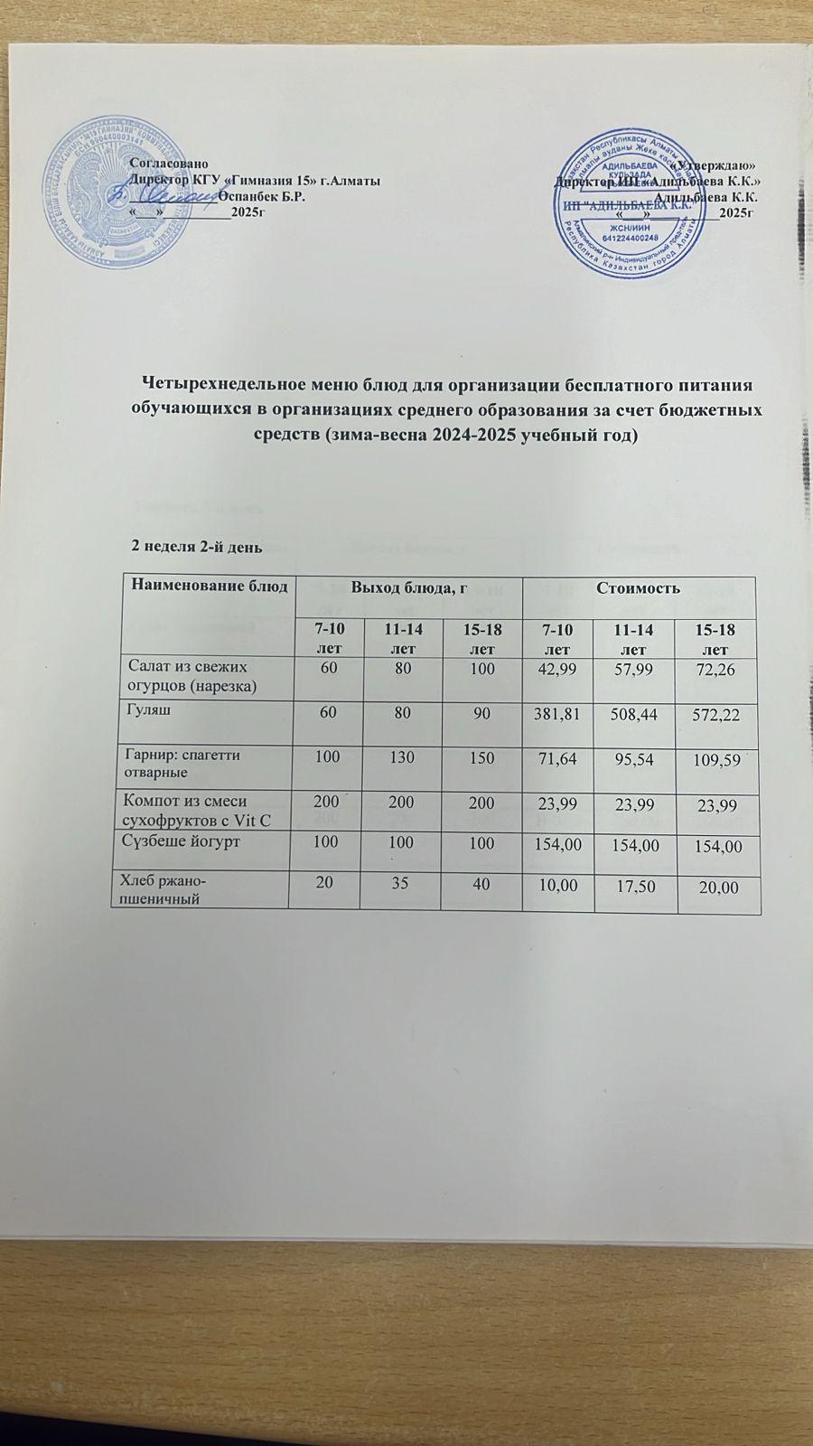 Ас мәзірі 2 апта 5 күн 14.02.2025