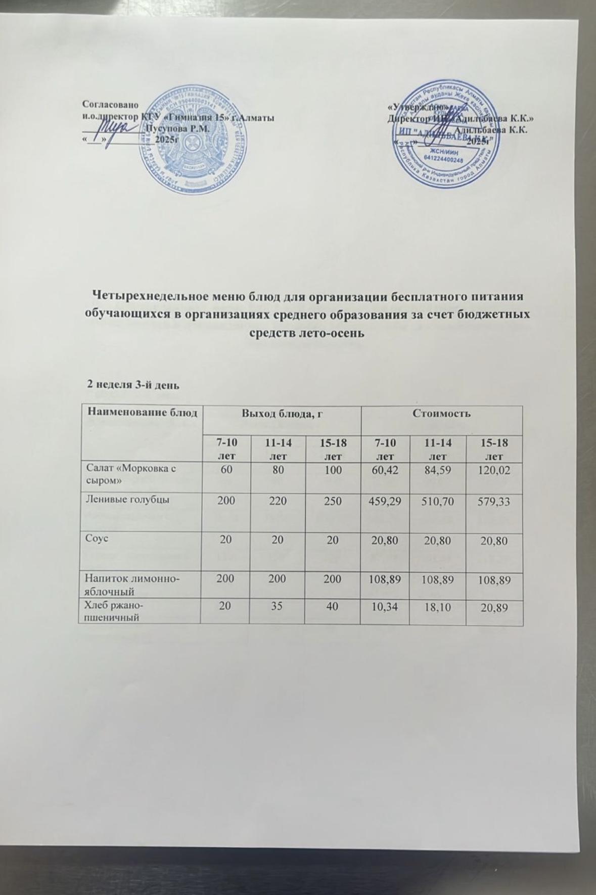 Ас мәзірі 2 апта 1 күн. 09.09.2024ж.