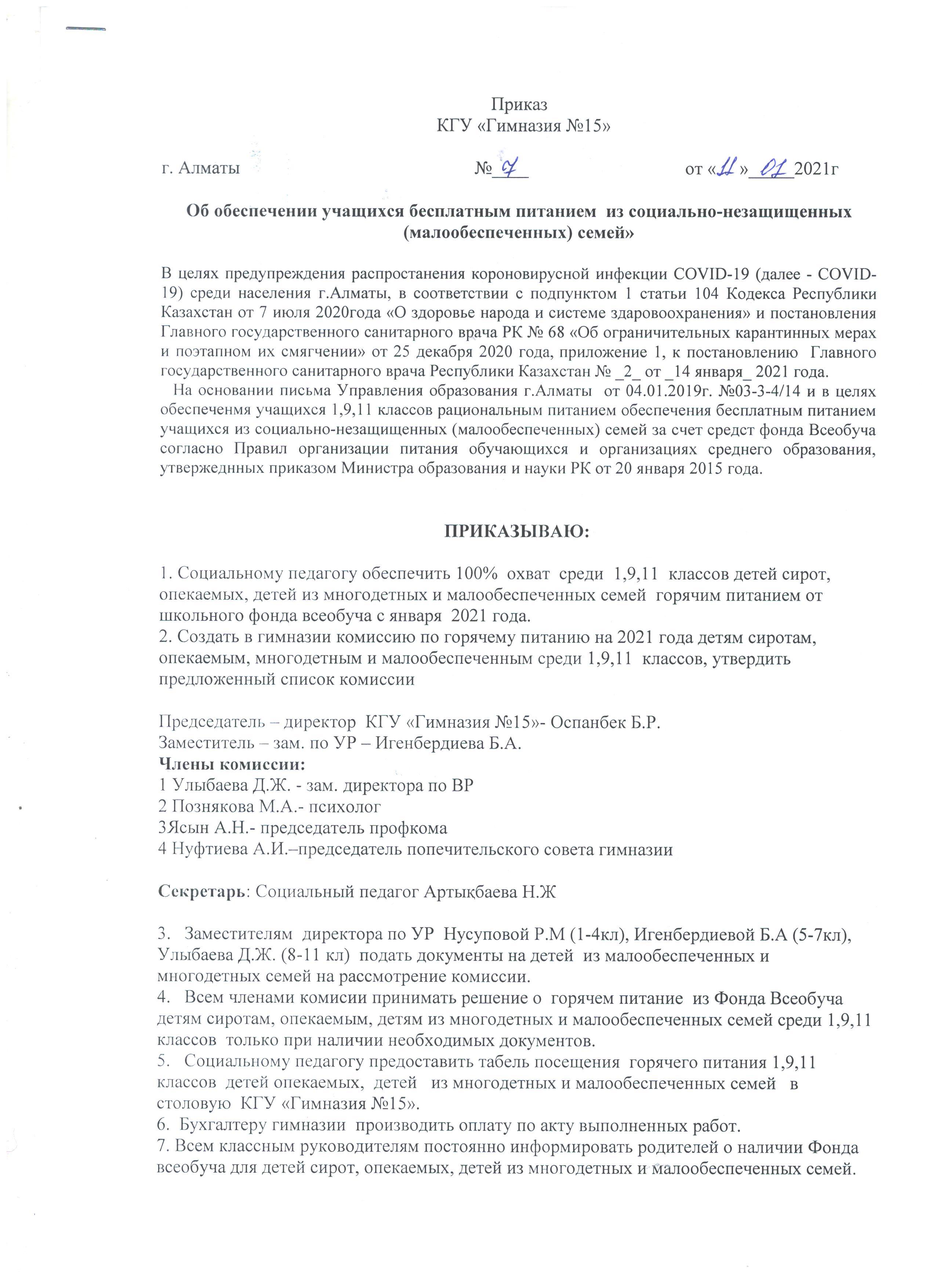 01 февраль 2021 0 1 2 3 4 5 Приказ "О назначении ответственного лица за организацию питания и создания комиссии по мониторингу за качеством питания учащихся" Осы беттің QR-коды:QR-код этой страницы: